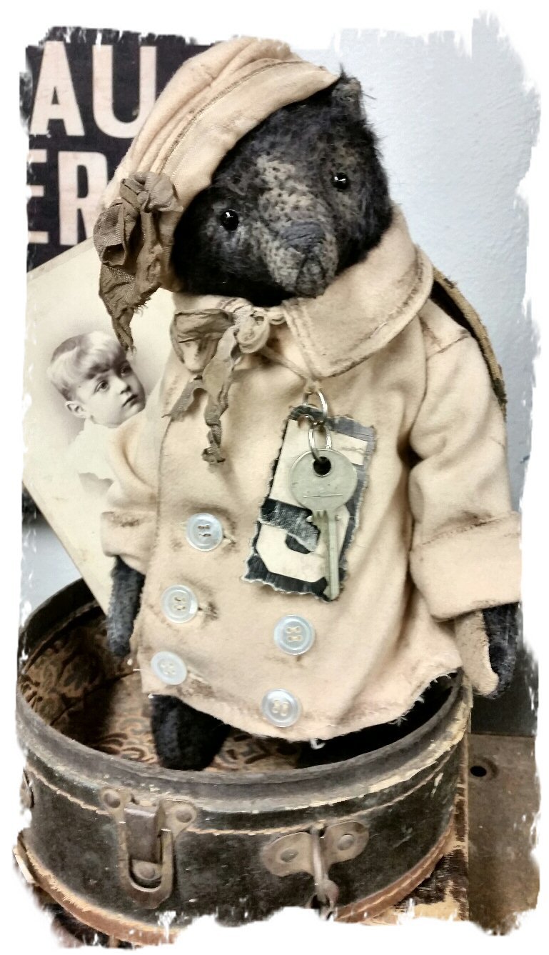 9" Vintage Antique style Girl Teddy Bear in antique black dolly coat by Whendi's Bears